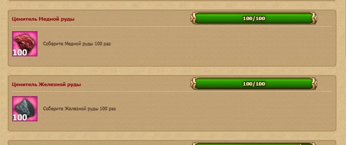 2. не дает достяг с рудой, дали только за сбор 1 штуки , до 100 и выше отсчета нет